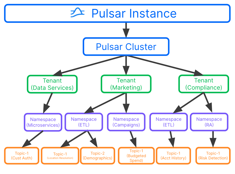 Namespaces live between tenants and topics, providing an additional layer where topics with similar policy or security requirements can be managed.