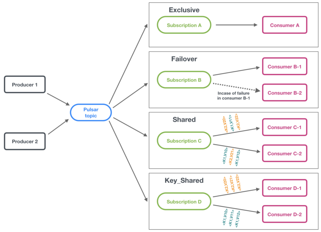 - Key_Shared: Multiple consumers can connect to the same subscription, but messages with the same key will always be sent to the same consumer.