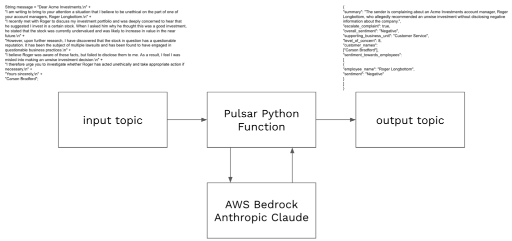 We’ve now converted unstructured text into a structured JSON that can be used to route the message for further processing. This was done using a Python Pulsar Function to make a simple API call to AWS Bedrock hosting Anthropic’s Claude.