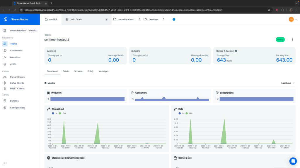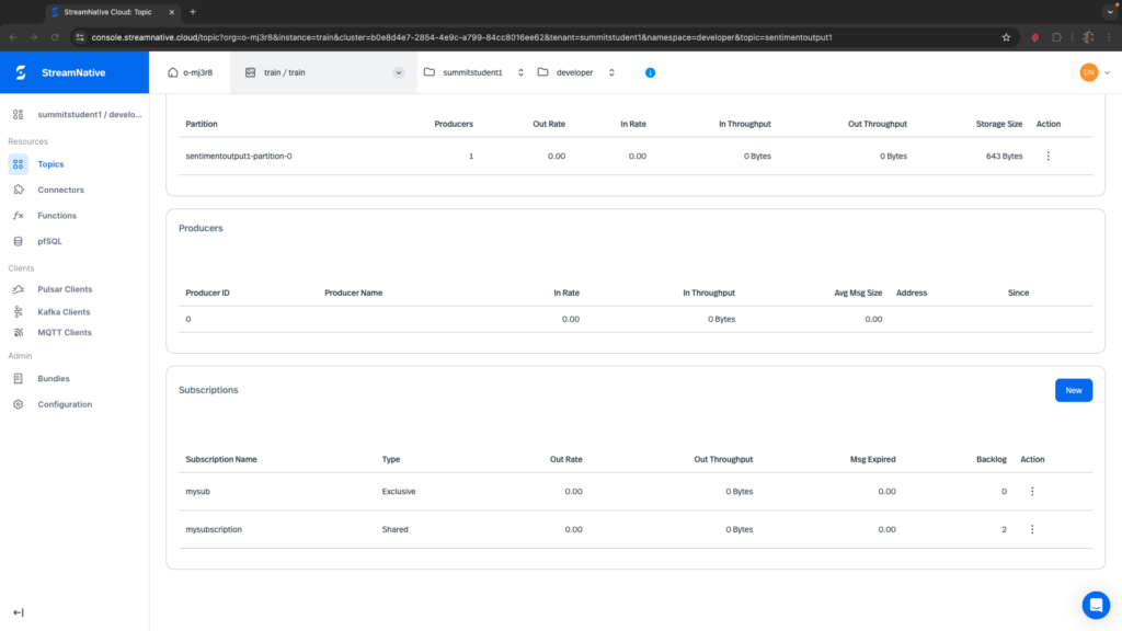 If the Pulsar Function triggered, you should see 1 in the Messages column for Sentiment1.