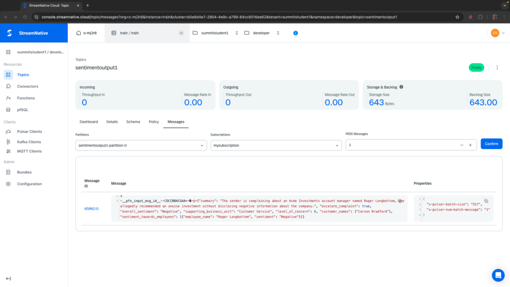 To test our Python Pulsar Function, we need to produce a string message to the topic specified in the –inputs field of the pulsarctl functions create command. In the example above this is summitstudent1/developer/sentimentinput1. This can be done easily using the Rest API with a walkthrough available here.
