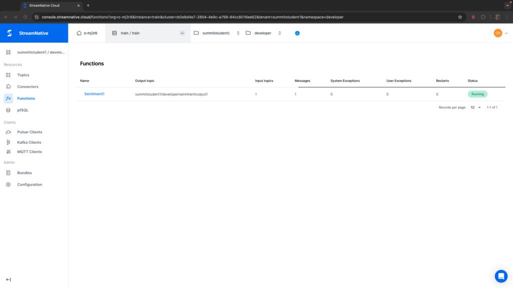 It may take a minute or two for the function to deploy. Once fully deployed, you should see Sentiment1 has a Status of Running on the Functions page for your tenant and namespace. If you see any System Exceptions, view Troubleshooting Pulsar Functions.