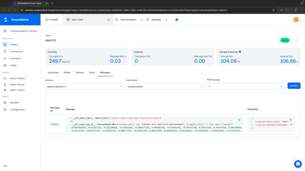 Navigating to the output topic of Sim1, simoutput1, let’s view the text of the top two results returned from the similarity search by creating a subscription and peeking at the messages. Since our search_query was related to cats, the top two results returned from the similarity search were related to cats.