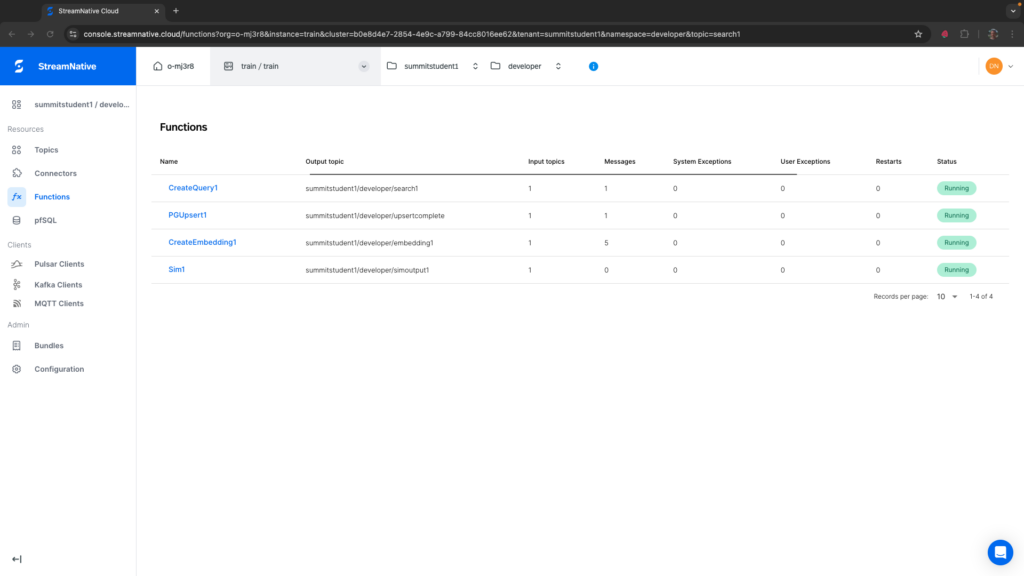 It may take a minute or two for the function to deploy. Once fully deployed, you should see Sim1 has a Status of Running. If you see any System Exceptions, view Troubleshooting Pulsar Functions.