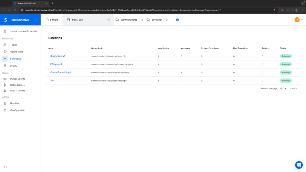 It may take a minute or two for the function to deploy. Once fully deployed, you should see CreateQuery1 has a Status of Running. If you see any System Exceptions, view Troubleshooting Pulsar Functions.