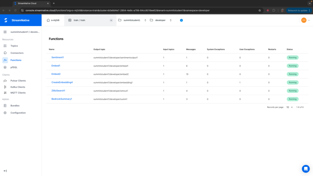In the scenario where there is a problem loading the Pulsar Function such as an incorrect class path in pulsarctl functions create, the Pulsar Function will restart repeatedly. In the below image, the class path referenced in pulsarctl functions create for CreateEmbedding1 doesn’t exist (deployed using –classname streamnativerag1.CreateCohereEmbeddin instead of –classname streamnativerag1.CreateCohereEmbedding).