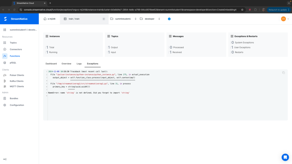 You will not observe a System Exception, but viewing the Logs you would find the following messages. “Could not import User Function Module” errors can come from multiple sources, but in this case we also see “module ‘streamnativerag1’ has no attribute ‘CreateCohereEmbeddin'”. You should delete the Pulsar Function and recreate it with the correct classname.